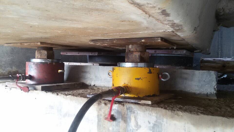 架設箱梁時,根據測量定位的位置及高程,箱梁落梁應先落在千斤頂上,再準確就位,隨後對支座下座板與支承墊石之間,錨栓孔內進行重力注漿。